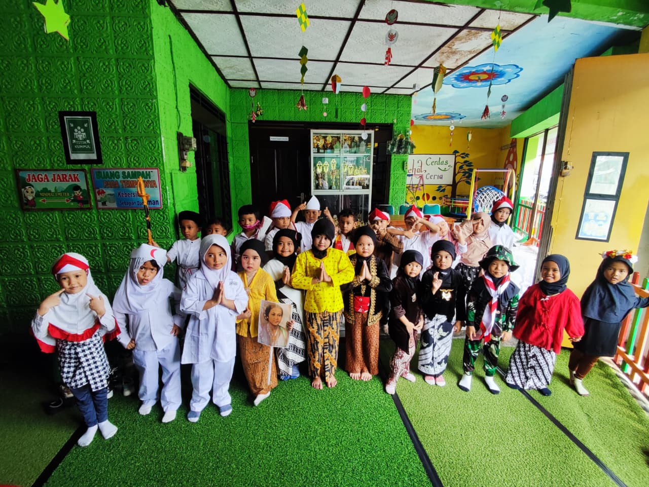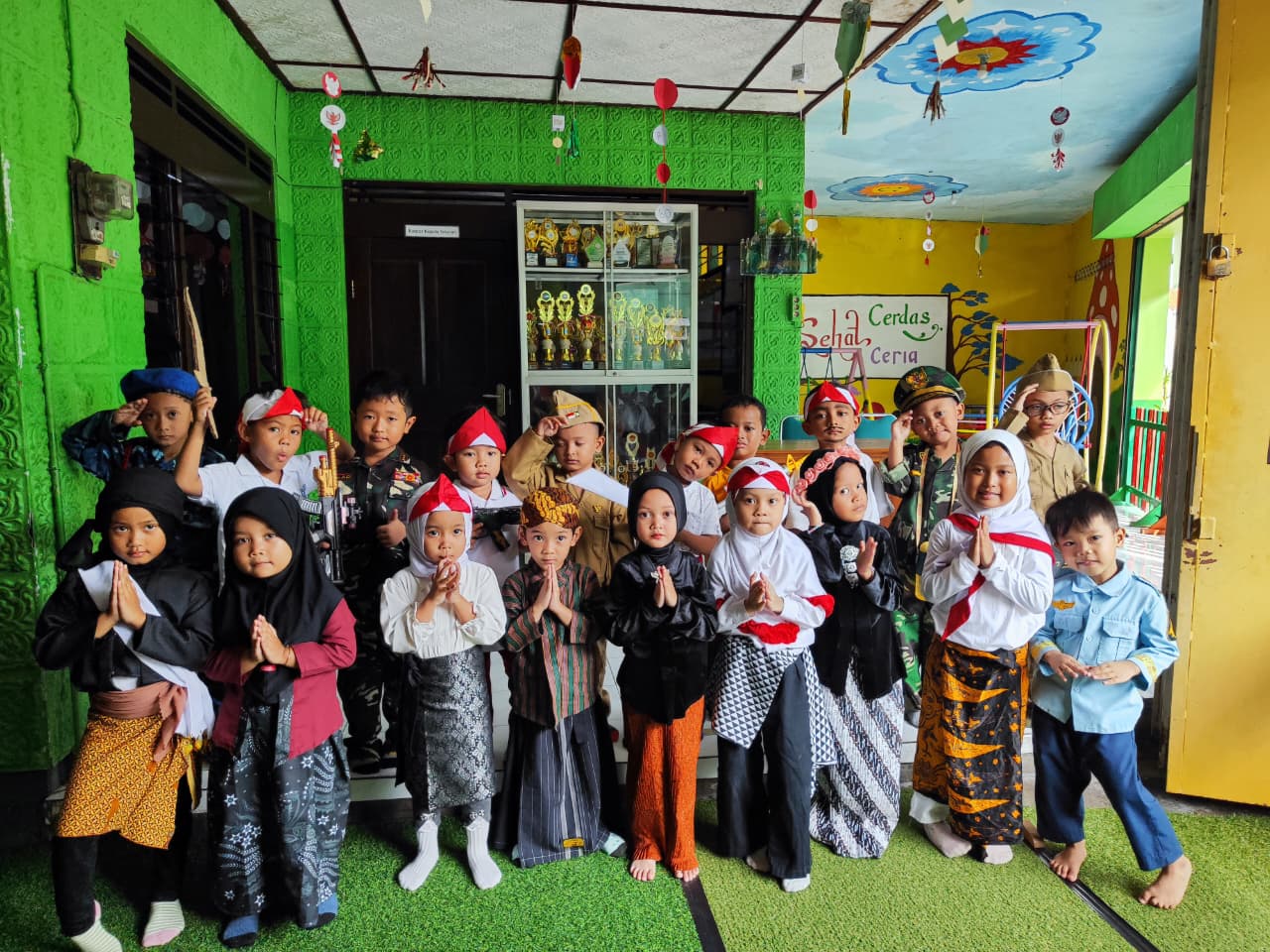 Anak-anak tampil mengenakan kostum pejuang dengan penuh semangat dan keceriaan. Melalui kegiatan ini, mereka diajak untuk mengenal jasa para pahlawan Indonesia dan belajar tentang pentingnya sikap berani, tangguh, dan rela berkorban demi bangsa.